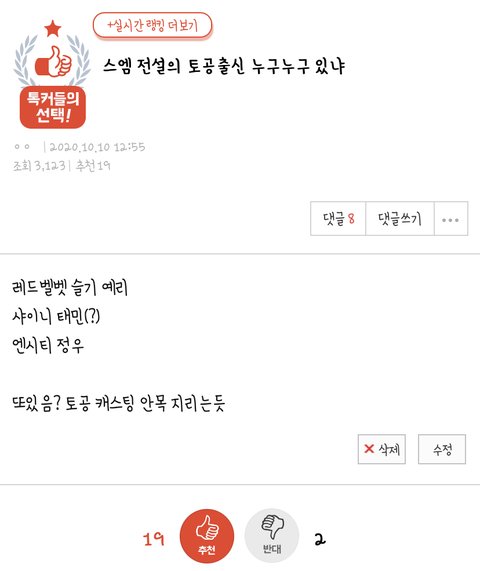 오 뭐야 톡선이네ㅋㅋ 태민은 기억이 어렴풋해서 물음표 붙였던건데 맞았구나 윤아 희철 해찬도 토공이라니 역시 지리는거 맞네.. 토공은 전설이다