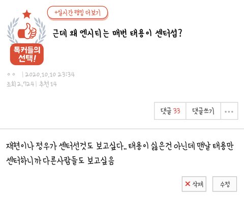 의도치 않게 톡선이네 다른 그룹들은 곡 분위기에 따라서 센터멤버 바꾸기도 하던데 엔시티에선 태용이 항상 센터길래 물어본거야 너무 나쁘게 생각하진 말아줘ㅠ