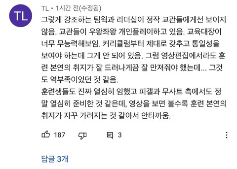 다들 자기 입장 좀 얘기해봐 어떻게 생각해? 난 교관들이 서로 말 안맞는 부분이랑 교육대장이 대장역할을 잘 못한다는거 그리고 조리돌림한건 잘못했다고 생각은 하는데