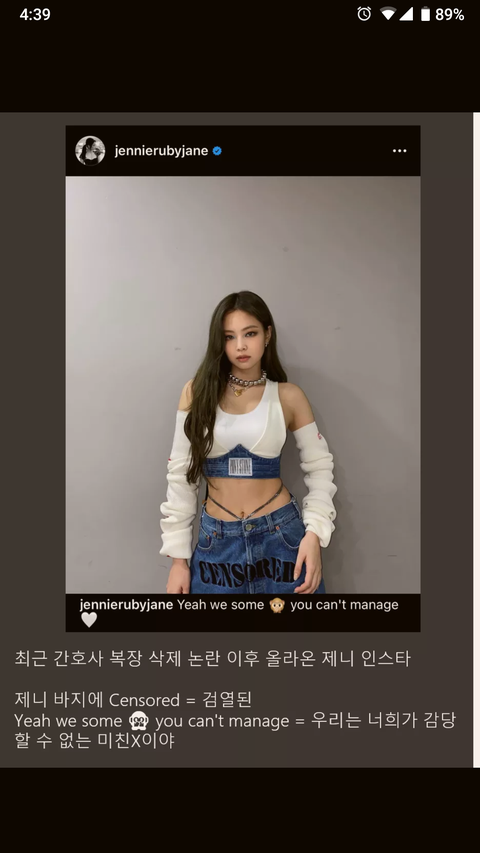 의상 논란때문에 개빡친 제니 인스타 ㄷㄷㄷㄷ