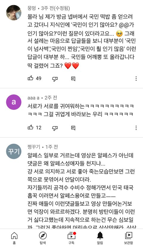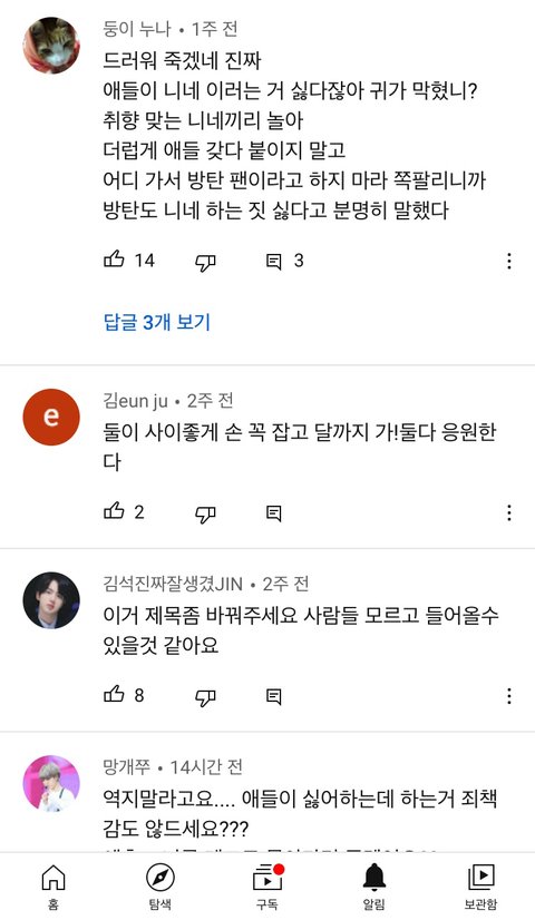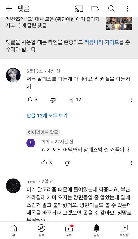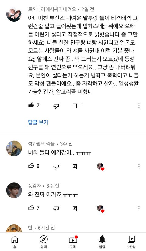 하... 유튜브 알고리즘 방탄 영상에 ‘부산즈’ 라고 떠서 케미 모아놓은줄 알고 봤는데 알페스영상이네? 애들이 싫다는데 공개적인 유튜브에서 저 ㅈㄹ하는것도 한심하다;; 역겨워