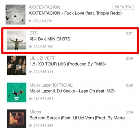 19일 지민의 자작곡 '약속'은 글로벌 음악 공유 플랫폼 사운드 클라우드에서 역대 최다 스트리밍 톱 2에 오르며 한국어 노래로는 최초이자 유일한 K팝 신기록을 달성했다.