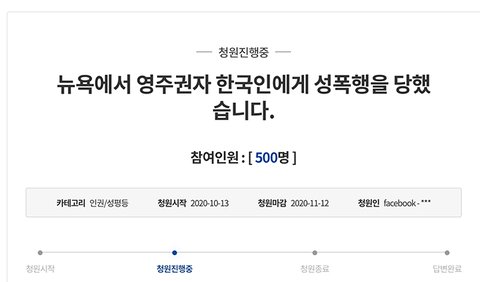더 많은 분들이 해외에서 일어나는 한국인 사회 내의 성범죄에 관해 경각심을 가지고 가해자가 법을 피해 한국으로 피해 도망가는 일이 없도록 도와주세요. --------추가영주권자는 영주권, 말 그대로 살 권리가 있는 사람을 뜻합니다. 군대 의무를 다하지 않아서 한국 여권과 미국 여권 둘 다를 소지하지 못한 영주권자요..... 시민권자가 진짜 미국 국민이고요 ㅠㅠㅠㅠㅠㅠㅠㅠㅠ 그리고 ..... 아니 ㅠㅠㅠㅠㅠ 저 유학생이라고요ㅠㅠㅠ 엄마아빠 다 한국에 계시고 저는 한국인이에요 ㅜ 가고 싶은 학교가 뉴욕에 있었을 뿐이지 혼자 미국에서 살다가 이번에 성폭행당해서 엄마아빠랑 동생이랑 매일매일 연락하고 지내지 원래 이렇게 시간마다 생존확인 하는 사이는 아니였어요.....아 저는 정말 말을 어떻게 해야할지 잘 모르겠습니다 ㅠㅠㅠㅠㅠ 그냥.. 저같은 피해자가 단 한명이라도 더 나오지 않게 도와주세요.. 제발요...