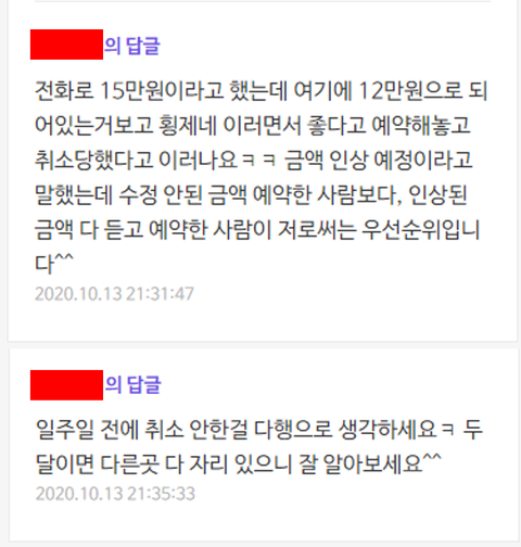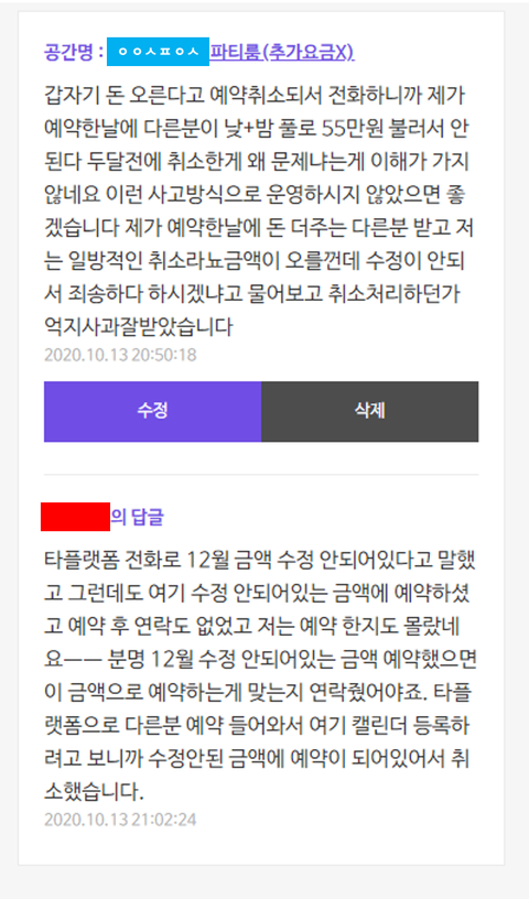 나한테 금액 잘못올렸다 사과하고 추가금액 설명 후에 내가 취소하면 다른 사람이 예약하던 말던 상관없는데 애초에 그냥 취소시키고 다른사람 추가라니?ㅋ...