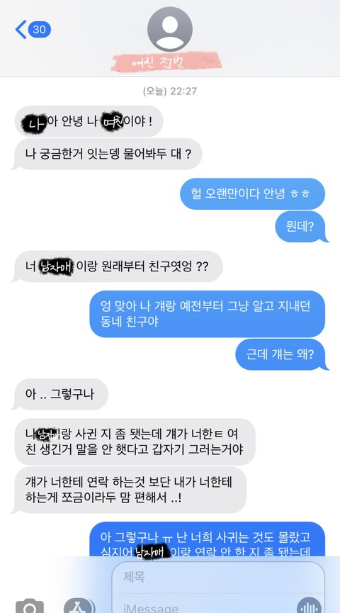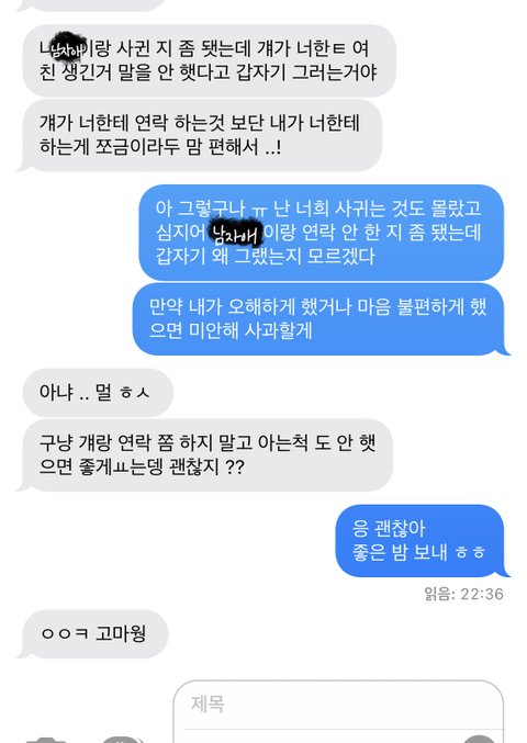 아니 나 어제 시험 끝나서 악의꽃 보고 있었는데 갑자기 모르는 번호로 문자가 와서 보니까 그 작년에 같은 반이던 여자애인 거야 내가 알던 남자애가 있는데 걔랑 사귄다고 그냥 주변에 얼쩡 거리지 말라고 연락한 거 같은데 나 답장 이상하게 했냐 설마? 괜찮음? 아니 너무 억울한 건 나 그 남자애랑 엄청 친한 것도 아니고 그냥 엄마들끼리 고등학교 동창이고 친해서 밥 몇 번 먹은 게 끝인데 ㅅ.ㅂ 걘 갑자기 내 이름을 꺼내고 지.랄인지 모르겠어 ㅠㅠ 지금 좀 횡설수설 해도 이해 부탁해 미안 밑에 대화 나눈 거 있어