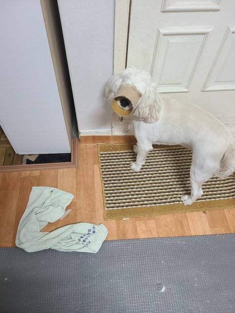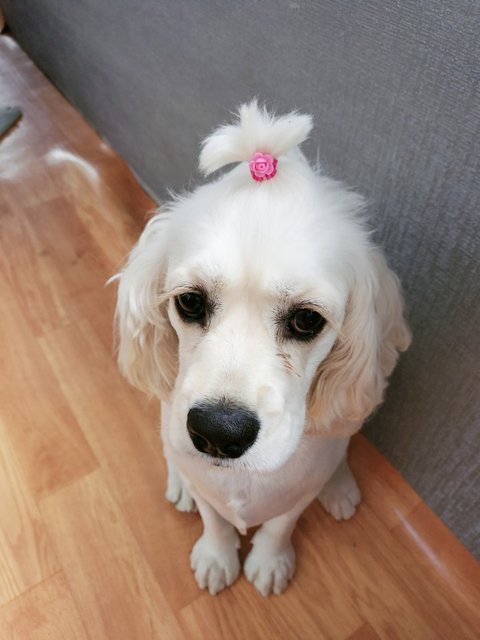 내가 만들어준 머리끈한 쪼꼬 (근데 디게 싫어함....ㅜㅜ)