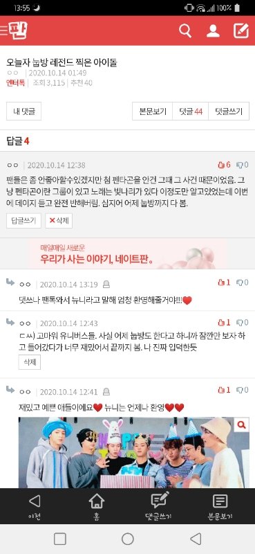 눕방 레전드 글에서 이 댓글 쓴 쓰니인데 뉴니라고 팬톡 한번 와보라고해서 함 와봤어!