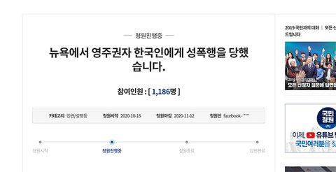 제 케이스 같은 경우는 제가 NYPD, 경찰에 신고를 마치고 진행해 나가는 중이나, 형사소송이라서 몇년이 걸릴지도 모르는 사건입니다. 하지만 그 전에 다른 가해자들에게 또 다시 피해자가 나오는 것을 최대한 막고싶어서 이렇게 제 사건을 알리는 것을 시작으로 한국인 성범죄에 해결방안을 모색하기 위해 청와대 청원도 넣었습니다. 사실 제가 알려야한다는 급한 마음만 앞서 글을 두서 없게 적긴 했으나, 제 마음을 간절히 알아주실 분도 계실거라 믿습니다.
