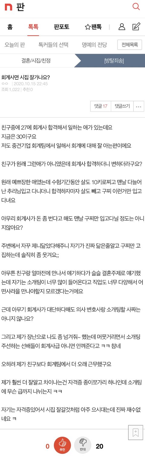 소개팅도 많이 하고 판사 검사 의사한테 시집가면 되잖아 ^^