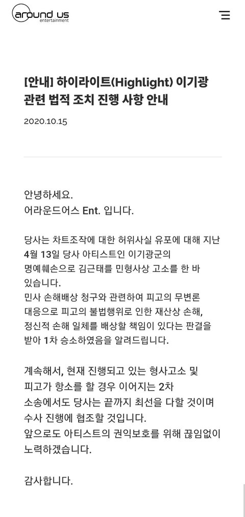 그래서 4월쯤에 이기광측에서 김근태를 고소했는데, 반응이 뻔뻔했지 "이기광의 고소장과 관련된 내용을 확인했다"며 "이미 고발장에 음원 조작 행위를 다 명시해서 제출했다. 기존 입장에서 변화는 없다"