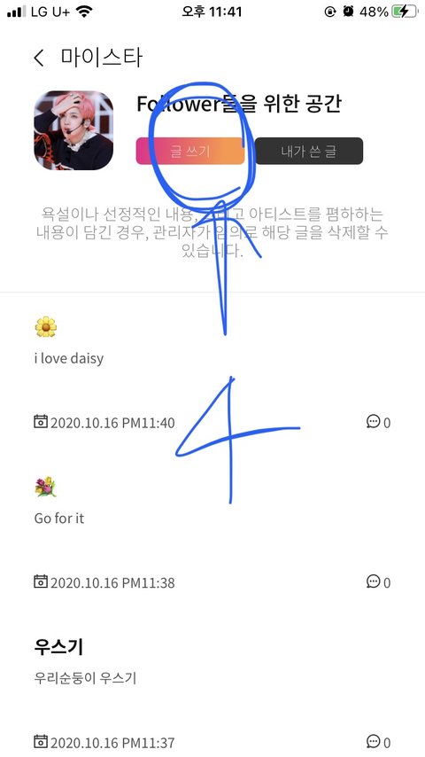 메뉴-마이스타 선택-마이스타에 있는 애들 사진 누르면 밑에 화면 나와! 저기 맨 윗쪽에 글쓰기 버튼 있어! 글쓰면 실버토큰 20씩 받는것 같아!!