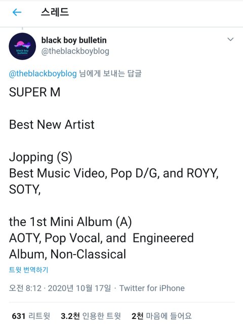 슈퍼엠은 올해의 신인 부문에 제출했고 쟈핑으로 올해의 팝 듀오/그룹, 올해의 레코드, 올해의 노래, 베스트 뮤직비디오