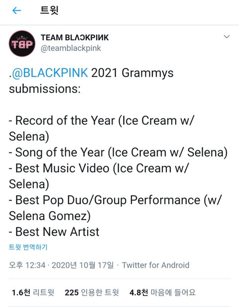 블랙핑크는 아이스크림으로 올해의 레코드, 올해의 노래, 베스트 뮤직비디오, 베스트 팝 듀오/그룹 퍼포먼스, 올해의 신인 총 5부문에 제출
