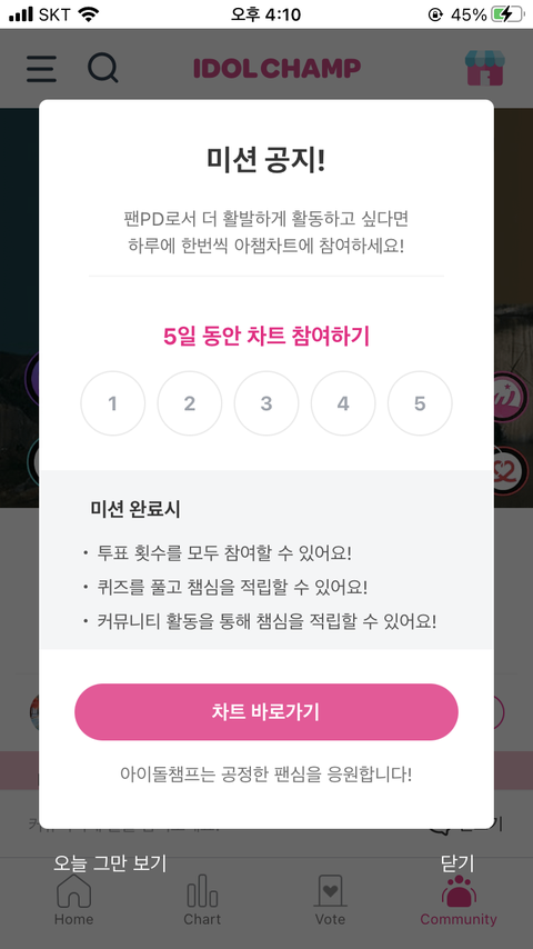 뉴즈니라 미안 ㅠㅠ 그런데 어제 광고보고 루비챔심 충전해서 투표했는데 오늘 왜 차트참여 1일차부터 시작인지 아는 즈니 있을까..? + 그리고 커뮤니티에 글쓰려고 하니까 이렇게 뜨는데 5일뒤부터 글쓸수있는거야?