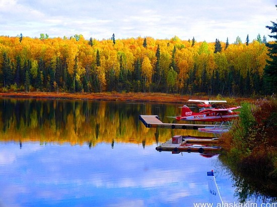 그 호수에는 디날리행 수상 경비행기들이 호수 위에서