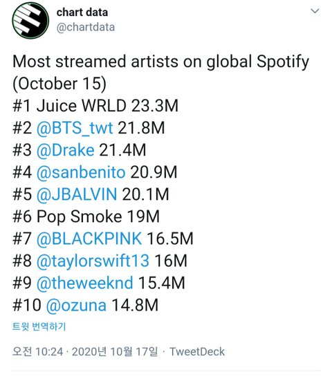 스포티파이 스밍 순위 보면 방탄은 매번 순위권 안에 있더라 내가 한 한 달 전부터 봤는데 테일러 스위프트 주스 월드 드레이크 샌 베니토 더 위켄드 방탄은 매번 있었는데 3일 전 차트에도 보니 있네...