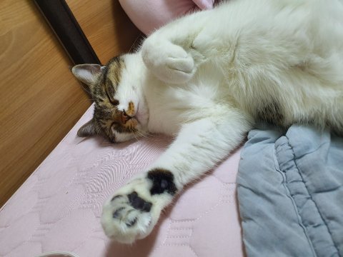특징)코 오른쪽에 무늬, 발은 전부 흰색, 발젤리는 검은색, 목등 부분에 발자국같은 점무늬 3개로 시작해요