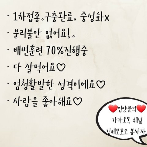 #입양시 검사/접종/치료비 후원 개념으로 책임비가 발생합니다! 책임비는 보호소 내 다른 아이들 병원비에 사용됩니다. ✔