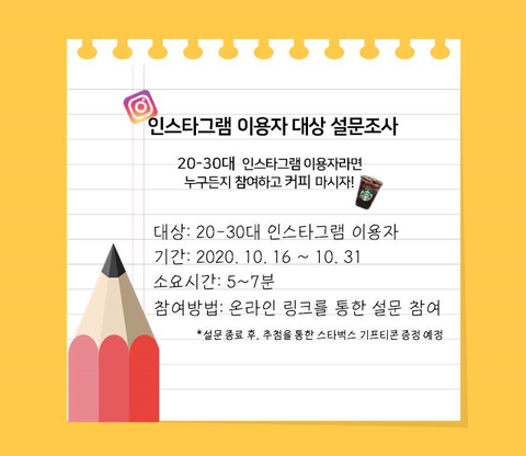 본 설문조사는 5-7분정도 소요되며, 인스타그램을 이용하고 계신다면 누구나 참여 가능합니다.