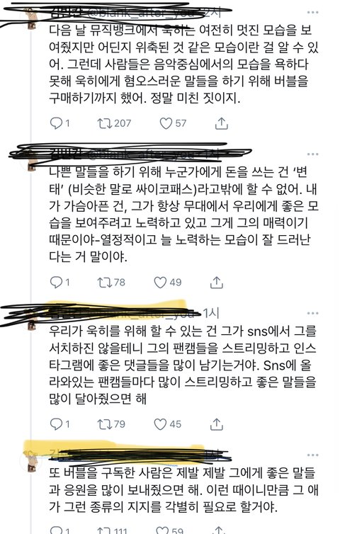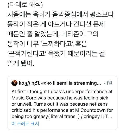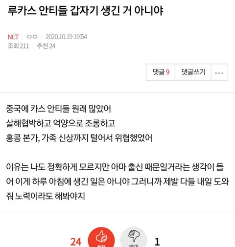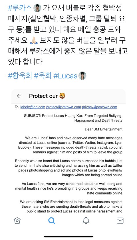 지금 루카스가 버블 리슨 인스타 등등 안티들한테 안 좋은 말 많이 듣고 있대(자살 종용성 등등) (버블 유출 미안해 금방 지울게) 그리고 사진 보면 알겠지만 본인 스스로도 힘들다고 말했어