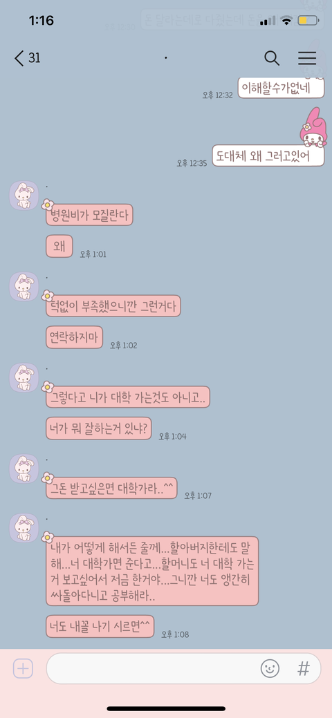 앞뒤안맞는 글 일수도있지만 읽어주셔서 감사합니다 .. 사진은 제가 엄마가 돈 다 가져간거 알고 카톡을 보냈는데 저렇게 답이 와서 화나 미쳐버릴거같아서 올려봐요
