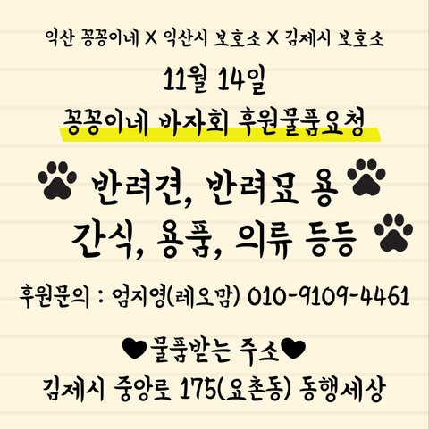 3. 동행세상 주관 성남시보호소와 김제시보호소 유기견 치료비 마련 및 항공요금 마련 나눔바자회 개최(아이들 치료비 및 항공요금 마련을 위해 강아지 관련 용품 후원도 부탁드립니다. 물품후원문의 : 레오맘 010-9109-4461)