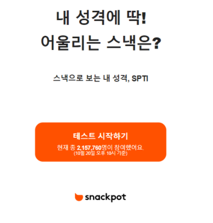 성격테스트 SPTI테스트가 지금 화제이다. SPTI는 SNACK+MBTI의 합성어로 스낵팟(snackpot)에서 할 수 있는 성격테스트다. 총 12개의 문답으로 구성된 SPTI은 성격분석과 함께 응답자와 잘 맞는 유형의 스낵을 찾아준다.