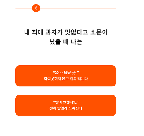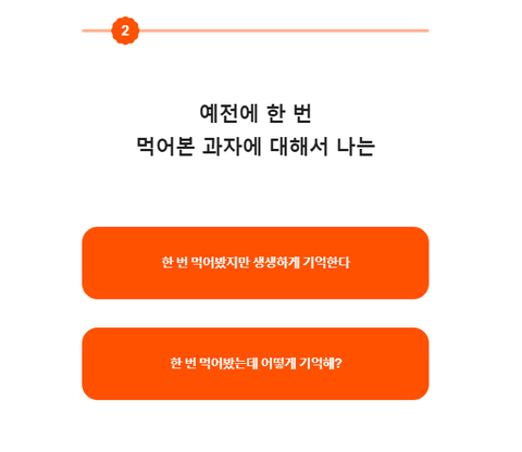 또 12개의 문항 중에는 과자와 관련된 질문들이 포함되어 있어 눈길을 끌었다. ‘예전에 한 번 먹어본 과자의 맛’에 대한 기억의 정도를 묻거나 ‘내 최애 과자가 맛없다고 소문이 났을 때 나의 반응’을 선택하는 질문들이 있다. 또 자신의 최애 과자에 대해 설명하는 방식을 묻는 질문도 있다.