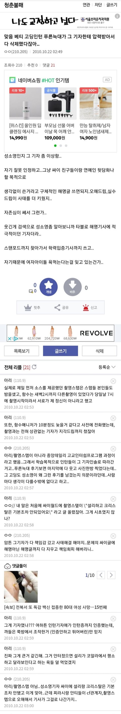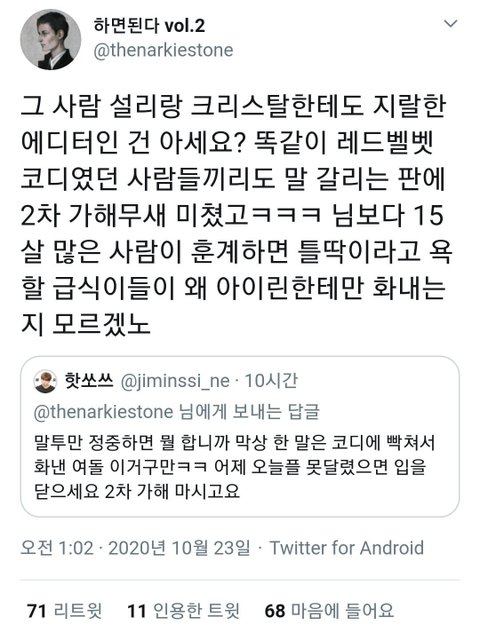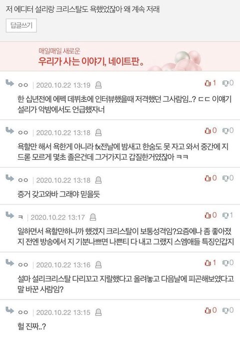 근거없는 네이트판 댓글 가져다가 저 사람이 설리 크리스탈도 저격했고 그때부터 이상했다고 여돌 저격 자주한단 식으로 몰아가고 이상한 사람 만들고 있음 하지만 정작 진짜 10년전 글 찾아보면 그 글을 올렸던 건 전혀 다른 사람... 피해자 2차가해 루머생성 심각한 듯