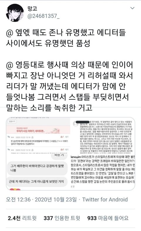 에디터가 참여했던 스케줄 인이어빠진 그 무대 아니더라 ㅋ 걍 에디터 말대로 조용히 아무것도 하지마 좀 ㅉ 괜히 그 에디터 건들이다가 스엠도 두손두발 든 그 녹취록 풀리면 어쩌려고