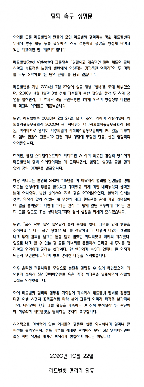 타커뮤에는 아이린 탈퇴 촉구 성명문까지 떴네