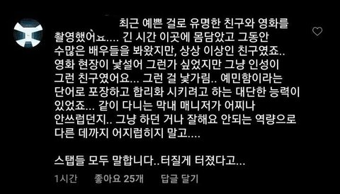 이 같은 사과에도 논란은 가라앉지 않고 SNS에 아이린과 관련한 여러 글들이 떠돌고 있다. 그 중 하나가 "최근 예쁜 걸로 유명한 친구와 영화를 촬영했어요"라는 SNS글이었다. 해당 글에는 "수많은 배우들을 봤지만 상상 이상인 친구였다" "영화 현장이 낯설어서 그런가 싶었지만 그냥 인성이 그런 친구였다" "그냥 하던 거나 잘해요. 안되는 역량으로 다른데까지 어지럽히지 말고. 스태프들 모두 말합니다. 터질게 터졌다고"고 적혀있다.