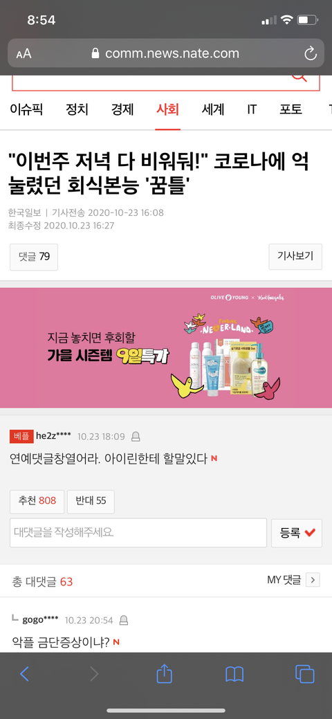 네이버도 연예댓글창 닫아놨더니 굳이 다른분야탭에 연예기사쓰고 사람들은 거기가서 댓글달더라ㅋㅋㅋㅋ 무의미