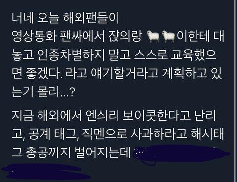다들 모르는거 아니지..? 멤버들 인종차별주의자 타이틀 만들어지고 아무런 연관 없는 멤버들한테 이런 피해 끼치는거 진짜 막아야하지 않을까?..