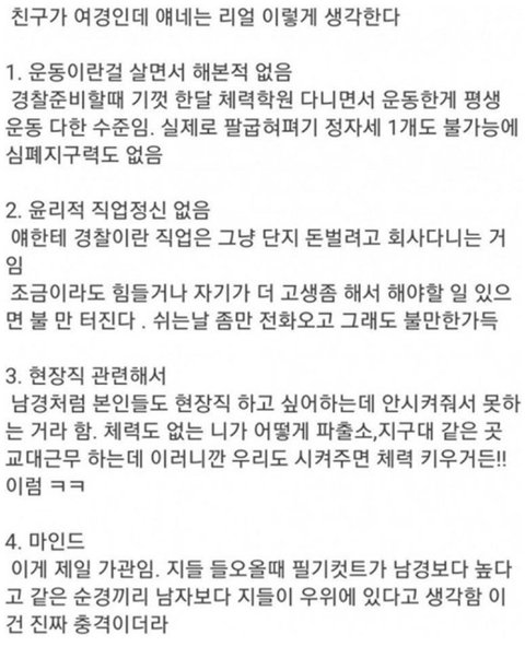 여경도 사람이고 사람마다 다른거지 어쩌라고 이런 글을 올리는건지. 저런 여경도 있고 현장에서 열심히 일하고 체력 관리하는 여경도 있는건데 참.