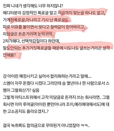 그렇게 아티스트위해서 고작 미담글로 돈까지 쓰는 회사라면.. 그럴회사면 이미 루머글(아이린 뿐만아니라 조이,예리에대해서도)에 대한 고소공지도 올라오겠지..?