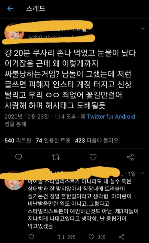 피드올라오고 그 분은 스타일리스트가 아니라 '에디터'라서 짧은치마와 관련이 없을 뿐더러 단기간 같이 일했어서 인이어 빠진 날짜에 일한 것도 아닌데 허위사실로 피해자 패다가 이젠 또 저지랄하고있음