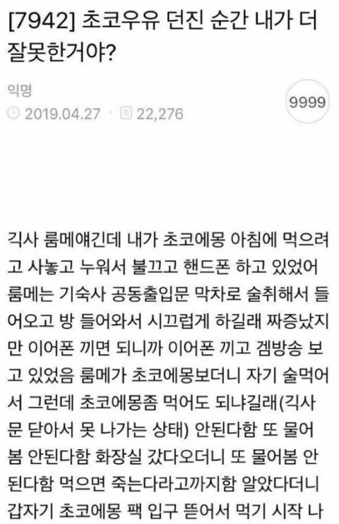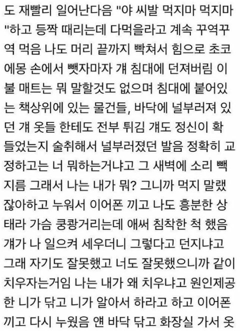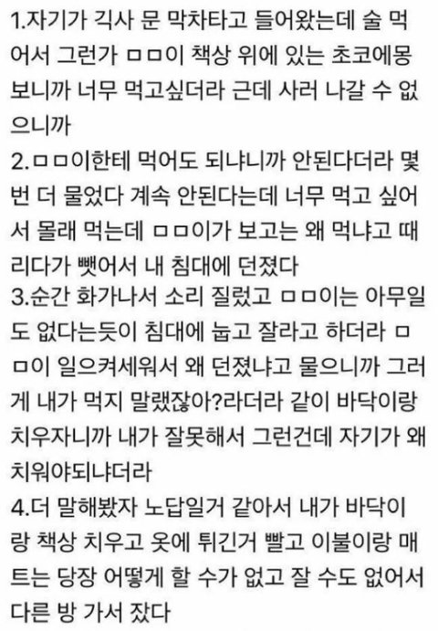 술 먹은 놈들은 본인이 얼마나 진상인지 모름. 그리고 먹지마라고 몇 번이나 말했는데도 술 취해가지고 먹은 사람이 원인 제공한 거지. 글쓴이가 초코에몽을 침대에 던졌으면 지가 한 행동이 이렇게 상대방을 빡치게 했구나 그걸 깨달아야지, 뭔 되도 않는 말을 씨부리고 앉아있어