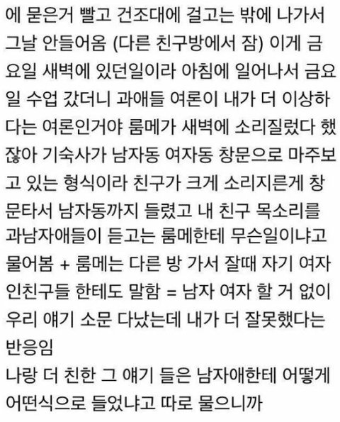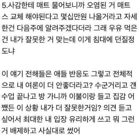 내가 전에도 댓글 썼었는데 당연 1차 잘못은 룸메임. 근데 저 글 쓰니는 화를 잘못낸거임. 초코우유를 바닥으로 던지거나 쓰레기통으로 던졌으면 될 걸 침대에 던지면 이불, 매트리스 다 버릴거 뻔한데 그정도 판단은 했어야함. 초코우유는 내가 감당할 선에서 던지든 버리든 하고 우유값 요구하고 과친구들한테도 이렇게된 상황 설명했으면 욕먹을 일도, 금전적으로 손해볼 일도 없었음. 법적으로 니가 날 화나게 만들었으니 내가 화가나서 망가뜨린것에 대한 보상도 니가 해야돼 이건 불가능함. 쓰니도 살면서 내가 손해보지 않을 방법을 잘 생각해봐야 함.