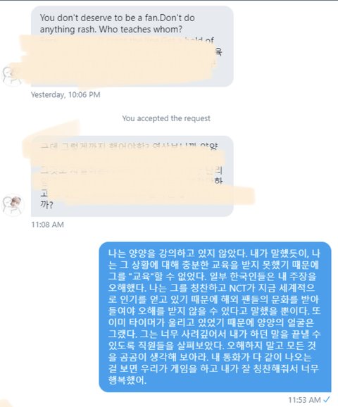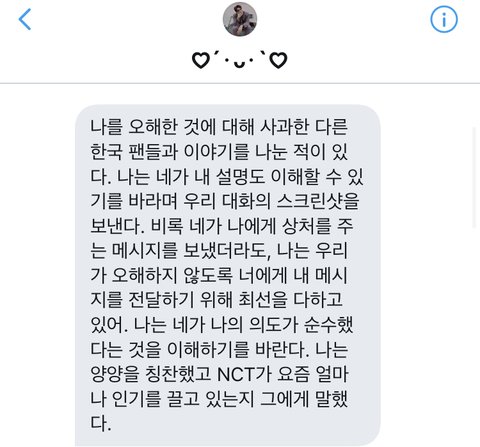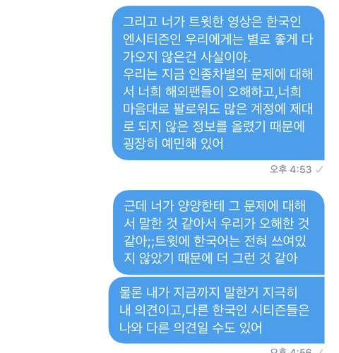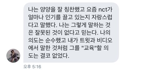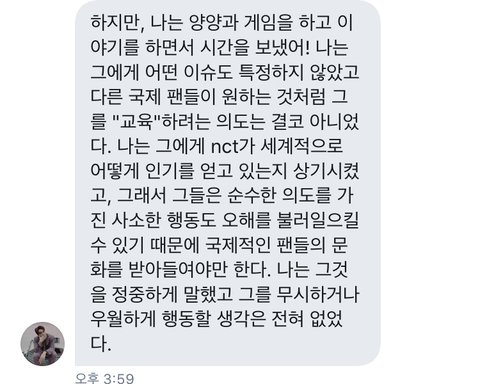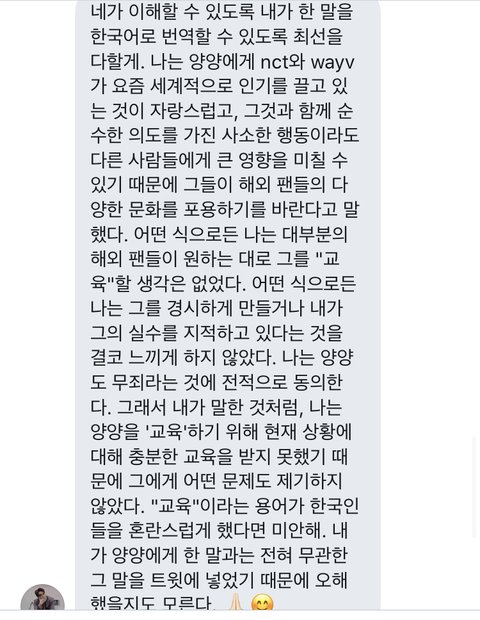 우선 빠르게 결론부터 말하자면,이 외즈니는 지금 문제가 되고 있는 인종차별에 대해서는 말하지 않았고,엔시티가 지금 해외적으로도 인기가 많아졌기 때문에 해외 문화를 받아들여야 어제 오늘처럼 문제와 오해가 생기지 않을 수 있다!이렇게만 말했데 양양이가 표정이 계속 굳은 이유는 시간이 얼마 남지 않아서이고,오히려 이 외즈니는 외퀴들이 인종차별로 멤버들을 안좋게 몰아 세우는 것에 대해서 반대하는 입장인 것 같아.본인도 그렇게 말했고