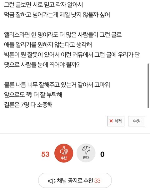 7명 소중하잖아 나도 힘들어도 팬톡에서 힘도 다시 받고 그래 여러모로 고맙고 앞으로도 먹금 잘 부탁해