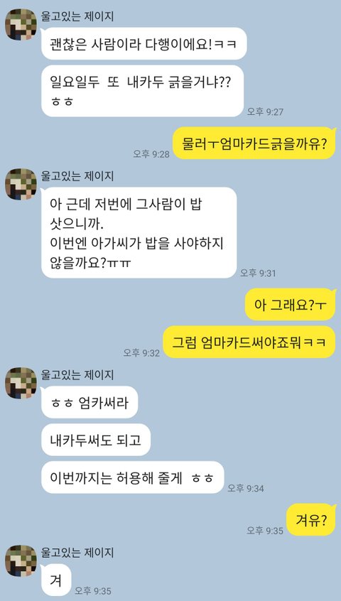 <동생의 입장>안녕하세요 위 글을 쓴 오빠의 동생입니다. 저의 입장은 이렇습니다. 오빠가 갑자기 소개팅을 해준다고 해서 평소엔 욕먹는다고 안해주더니 왠일인가 싶고 기쁘기도 했습니다. 다만 제가 당시에 취업은 됐지만 아직 일은 시작하지 않았어서 돈이 없는 상황이었습니다. 그래서 일 시작하고 월급타고 나서 하면 안되냐고 했는데 그때는 늦는다고 하더라구요 ㅠ 그래서 어떻게 하지 고민했더니 오빠가 커피정도만 일단 사라고 하더라구요. 그 정도는 있지 않냐고 근데 만약에 잘되게 되면 그 뒤에도 계속 만나야하지 않겠냐고 하면서 고민을 했더니 오빠가 선뜻 카드를 빌려준다고 하더라구요. 너무 고마웠습니다. 그래서 결국 오빠가 다음주에 와서 카드를 주고 가면서 잘하고 오라고 하더라구요. 그렇게 카드를 받고 소개팅을 다녀왔습니다. 나름 오빠 카드로 많이 쓰기도 그래서 카페에서 음료를 결제했습니다. 그리고나서 그 분과 잘 되어서 다음주에 또 보게되었어요. 오빠카드를 계속 쓰기도 그래서 엄마카드를 써야 하나 고민하고 있었습니다. 그런데 며칠 후 오빠에게 카톡이 왔습니다. 카톡내용을 첨부하겠습니다.