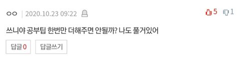 나는 그냥 다들 아는방법대로 공부해서 딱히 팁이 없어...ㅠㅠ 그래도 일단 내 공부법 써놓긴해볼게! 일단 수학은 문제 많이 풀어보고 틀렸던 문제는 공책에 옮겨적어서 아예 새로 풀어보는 편이고 많이 틀리는 유형을 많이 풀어보는거같아! 그리고 암기과목은 계속 읽고 쓰고 반복하는거같아 책 한 번 읽고 책 안 보고 소리내서 읽어보고 어느정도 다 외운거같으면 그때는 책 아예 안 보고 처음부터 끝까지 공책에 적어보고 이런식으로!! 이게 전부당,,