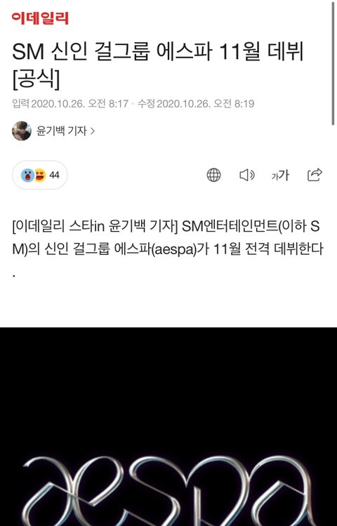 스엠 에스파라는 신인 여돌 11월에 데뷔한대 ㅋㅋㅋㅋㅋ 그럼 ㅇㅈㅁ..? 걔도 하려나 쨋든 스엠 손절이 빠른 건지 아니면 원래 계획된 건지............