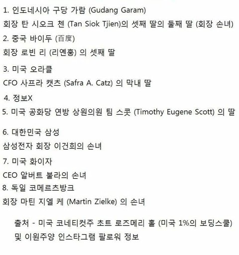 응 그만올려. 저거 다 구라임. 2번 중국인 아니고 홍정욱 둘째딸이고 오라클 회장은 아들만 둘임. 미국 상원의원은 미혼이고