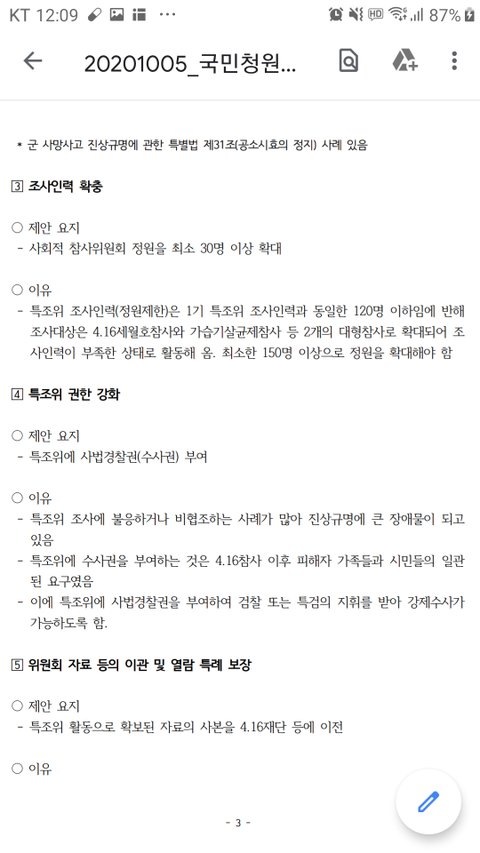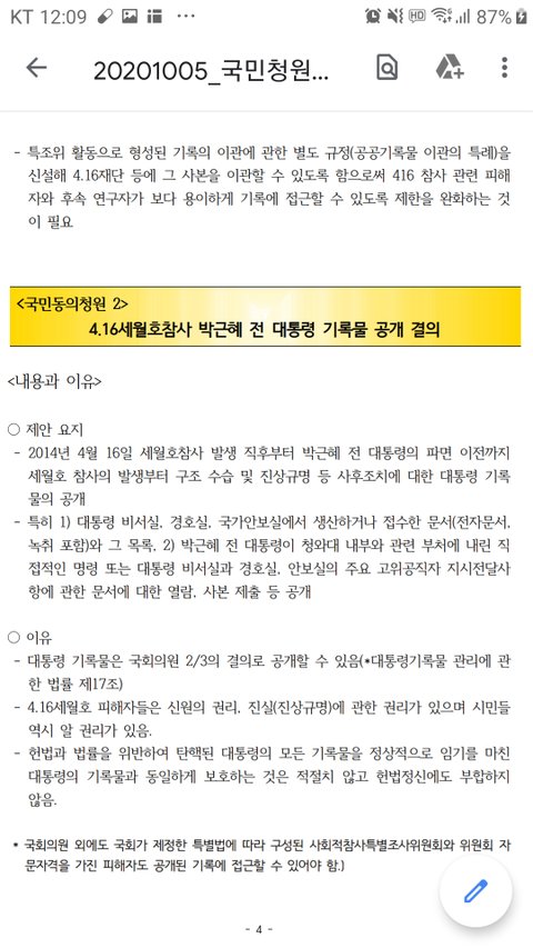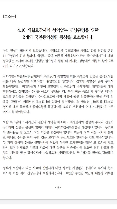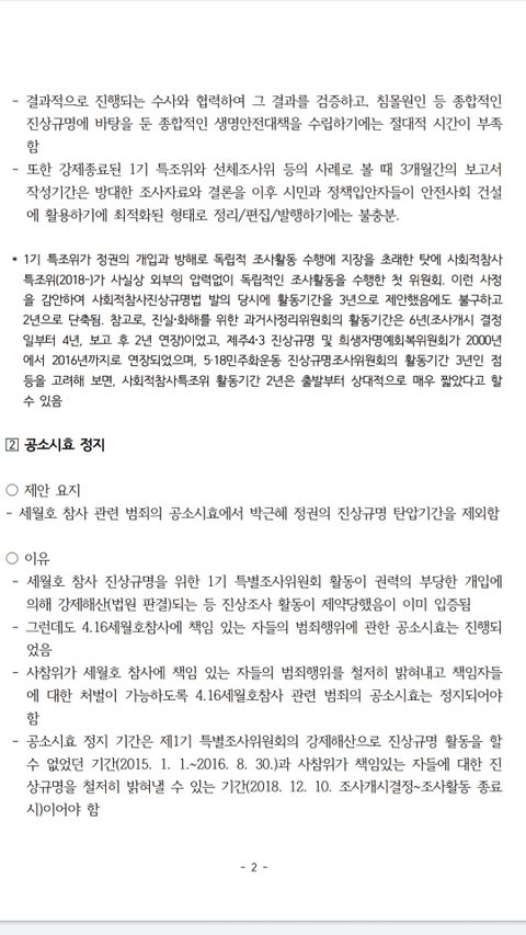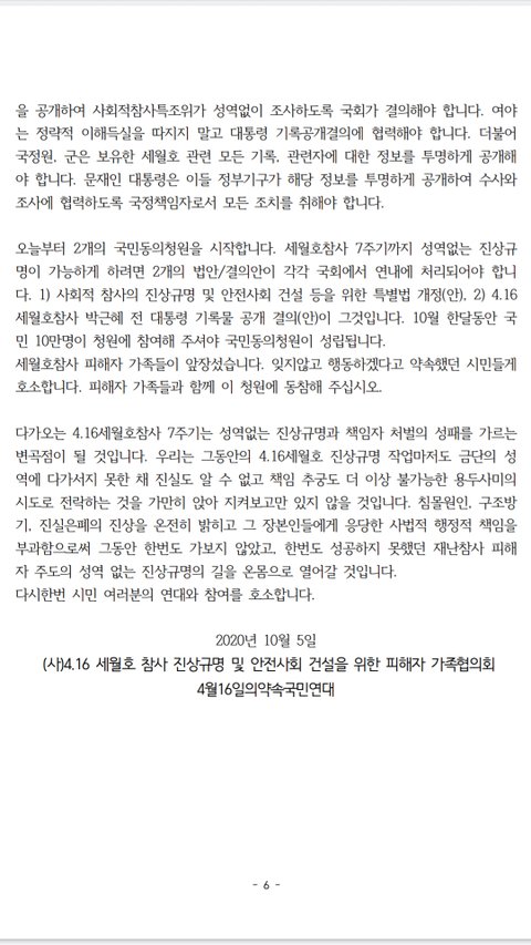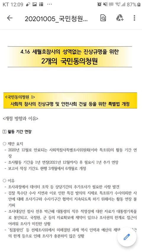 안녕하십니까...2014년 4.16세월호 참사의 진실을 밝히기 위한 사회적참사특별조사위원회의 활동이 2020년 12월에 만료된다고 합니다.만료 후 조사보고서 작성 기간이 3개월이지만,전 대통령 기록물도 봉인되어있고(국회 동의 2/3을 얻어야 함, 2번째 청원), 국정원이나 군 자료는 조사가 어렵기도 합니다. 수사가 제대로 진행되지 못하고 있습니다.또한 믿을수 없지만, 특조위에 수사권이 부여되지 못했습니다.그래서 조사기간이 더 필요하다고 합니다.현재를 살아가는 사람들이 함께 행동하기를 원합니다.세월호 참사 범죄의 공소시효가 2021년 4월 15일입니다.11월 5일까지인 청원이니 공감하시는 분들은 가까운 분들과 함께 참여해주시길 바라는 마음입니다.청원에 들어가시면 자세한 내용이 길지 않게 나와있습니다.*국회청원은 회원가입, 본인인증 절차가 있기 때문에, 권유로 끝나면 안되고 1:1로 같이 하는것까지 해야합니다. 저는 문자로 본인인증하는 절차 때문에 컴퓨터에서 하는 것이 오히려 쉬웠습니다.<<개정 요지>> 1. 사회적참사특별조사위원회의 활동기간 연장 2. 4.16 세월호 참사 관련 범죄의 공소시효 정지 3. 사회적참사특별조사위원회의 조사인력 정원 확대 4. 사회적참사특별조사위원회에 사법경찰권(수사권) 부여 5. 사회적참사특별조사위원회의 활동 기록물 이관 근거 규정 마련1. 진상규명 특별법 개정(공소시효정지, 수사권 부여): https://petitions.assembly.go.kr/status/registered/AEC2BC0CE7A259F0E054A0369F40E84E2. 박근혜의 7시간!! 대통령기록물 공개: https://petitions.assembly.go.kr/status/registered/AEE26958ACD35D90E054A0369F40E84E※ 스마트폰으로 국민동의청원 참여하기1. 카드뉴스 보고 따라 하기: https://pf.kakao.com/_LzwzK/573392282. 아이폰 따라 하기: https://youtu.be/qCzunrkH8aE3. 안드로이드폰 따라 하기: https://youtu.be/5YR_pp1wVbU