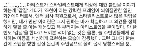 문제 생긴 보그 출신 에디터 분과 같은곳인 보그 코리아에서 일했던 다른 에디터분이 어느정도 상황 증언 해주셨어 ㅠㅠ 같은 회사 출신이니까 믿을수 있는 글일거야.... 스타일리스트에게 의상에 대한 불만을 이야기 했던거래..ㅠㅠ. 어쨌든 아이린이 윗선배에게 잘못 인정하고 사과한건 사실이고 그 에디터분도 사과받아들이고 더이상 추측성 기사화 원하지 않는다고 했어. 여기까지 모두 다 팩트다 ㅠㅠ 제발 정확한 사실만 얘기하자 ㅠㅠㅠㅠ 허위사실들이 너무 많아.