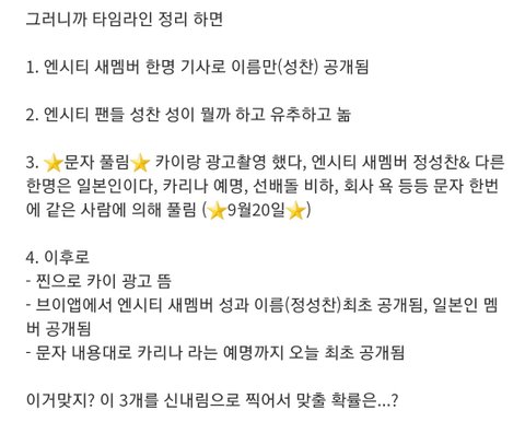 이정도로 유지민 예명이 카리나인건 8월부터 이미 알려져있던거고, 조작된 문자내용에 '카리나'가 언급되어있으니까 찐이라는 주장은 말도 안된다는 거임