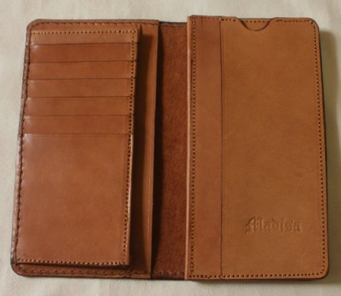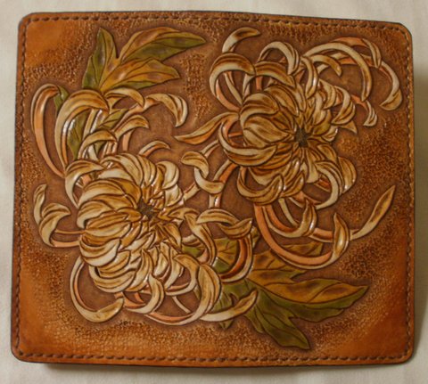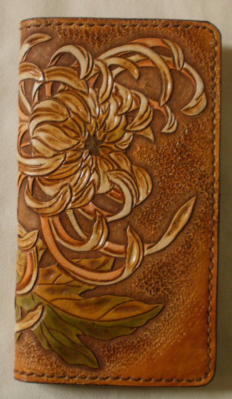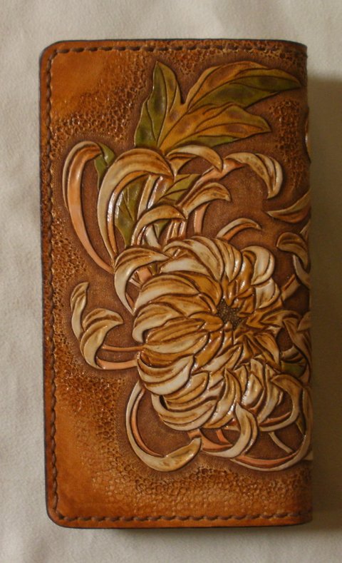 가죽에 국화 디자인을 카빙하고 천연염색하여 제작한 휴대폰 수납가능한 핸드메이드 다용도 장지갑입니다.(마디샤