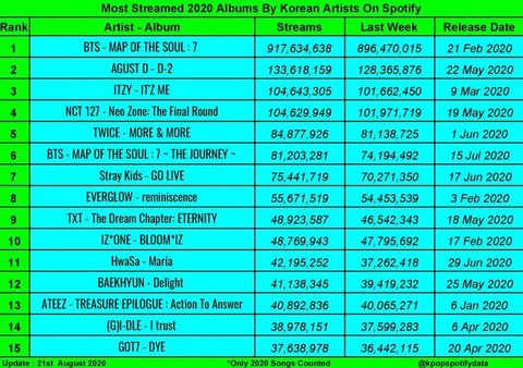 이 짤은 9월초에 올라온 한국 가수 스포티파이 앨범 스트리밍 순위 임. (nct는 리팩 포함)